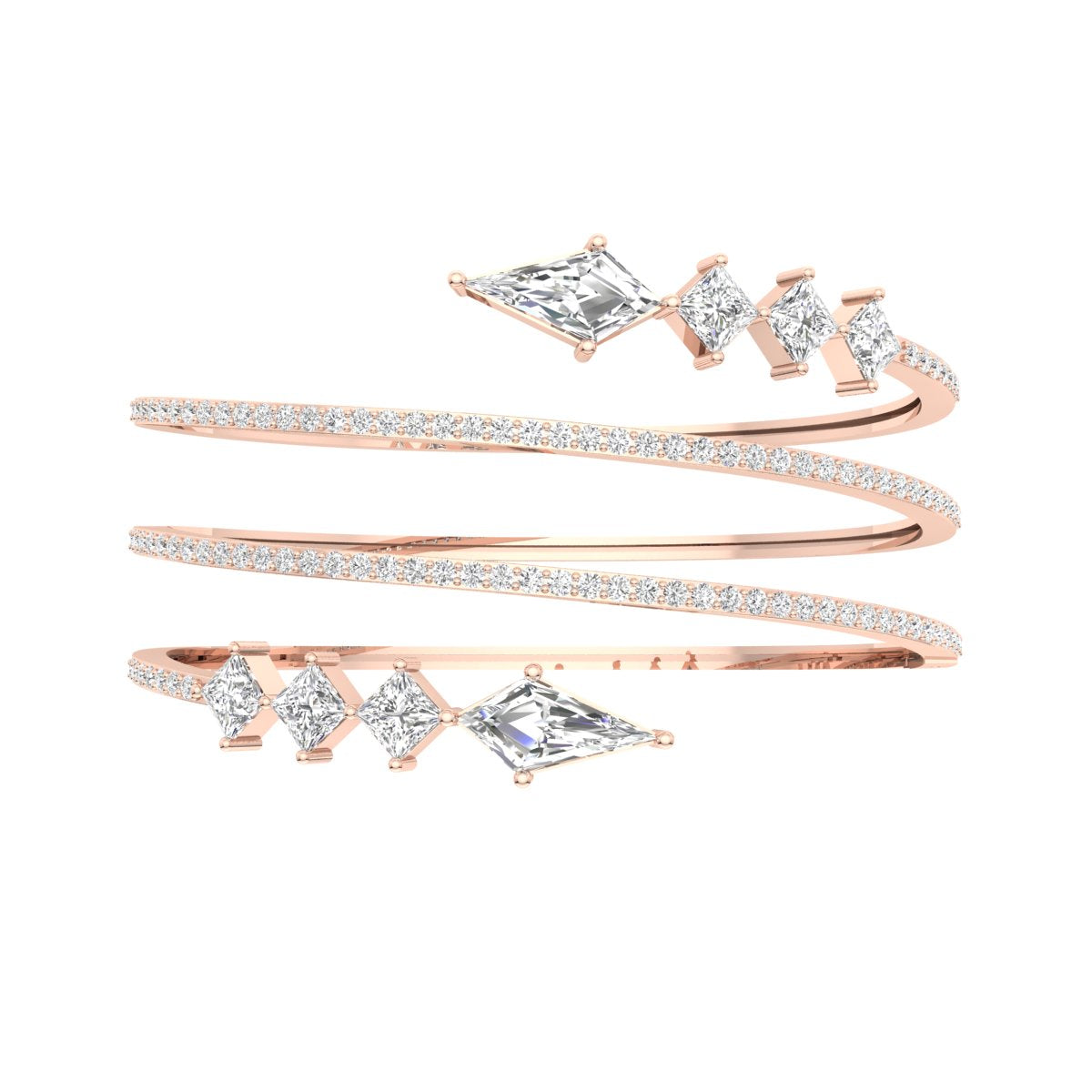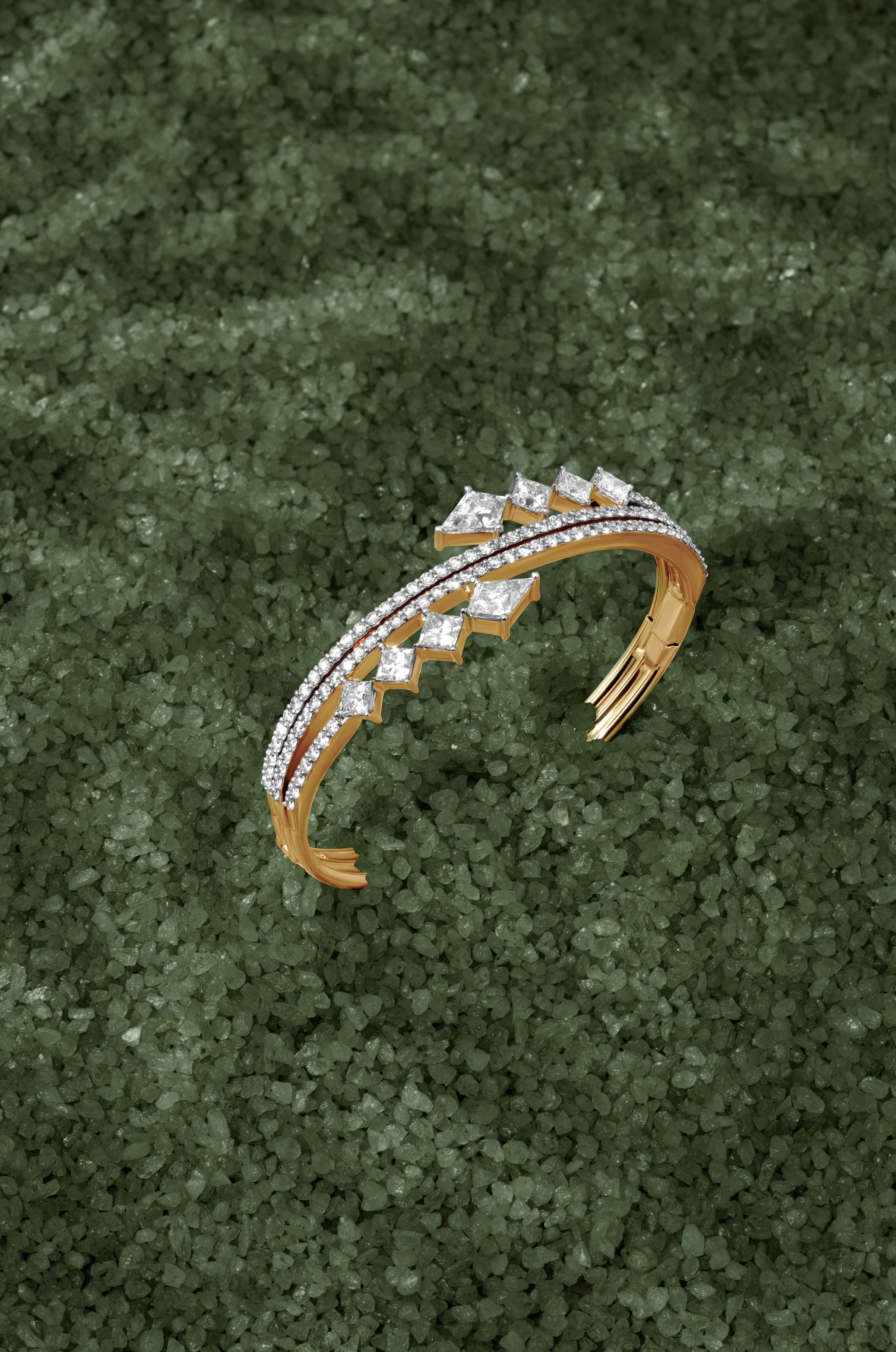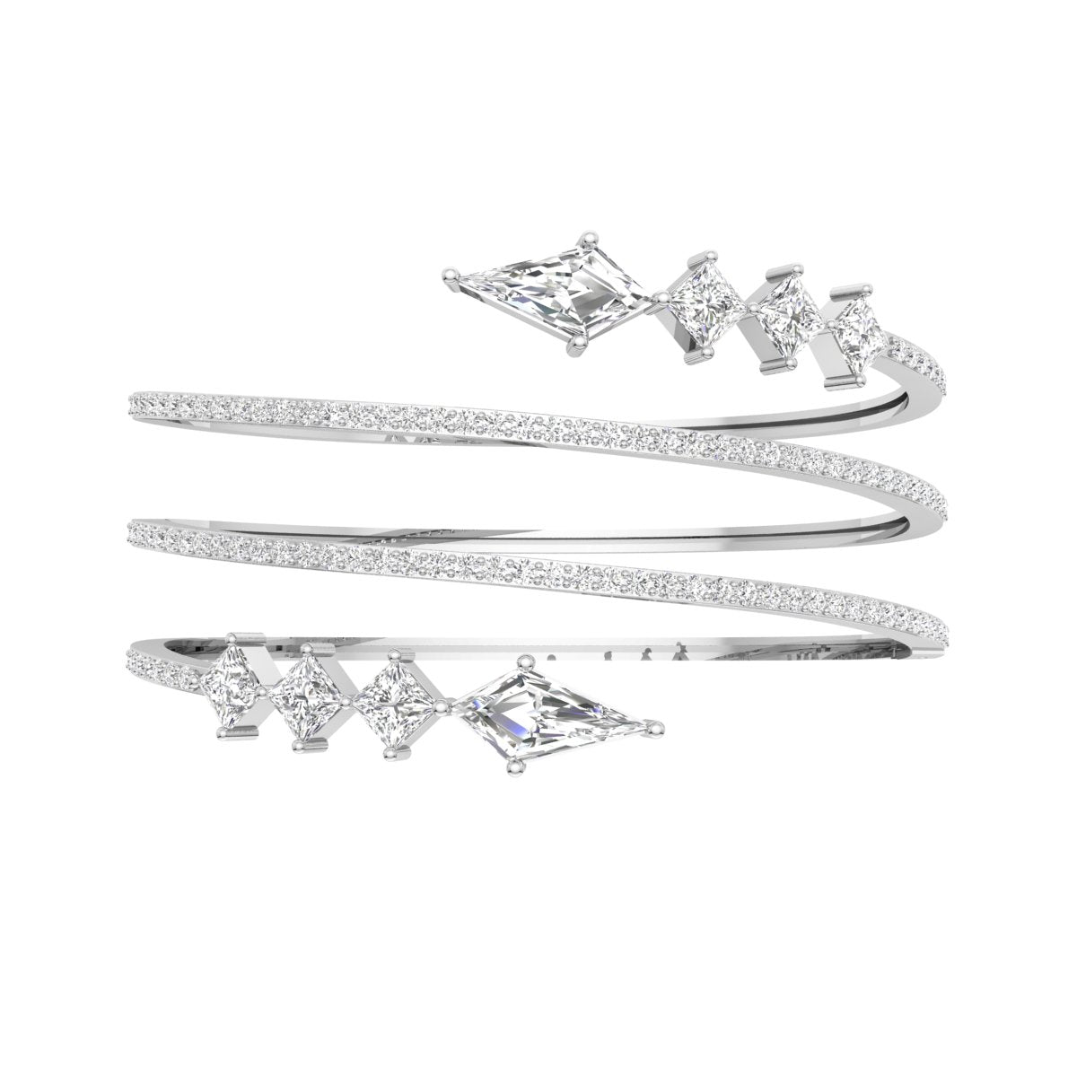 Command attention with The Aura Bracelet, a high jewelry masterpiece from Novaro. This distinctive design embraces your wrist a radiant stream of round-cut diamonds that culminate in two striking kite-cut lab-grown diamonds and precise princess-cut accents. It's a bold fusion of geometric artistry and dazzling sparkle, inviting you to define your own luxury and transform every moment into an unforgettable statement.