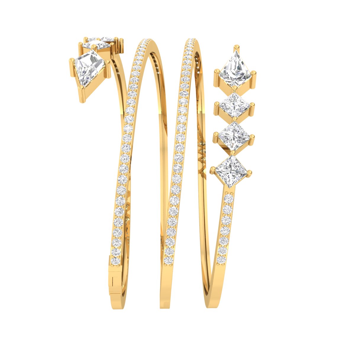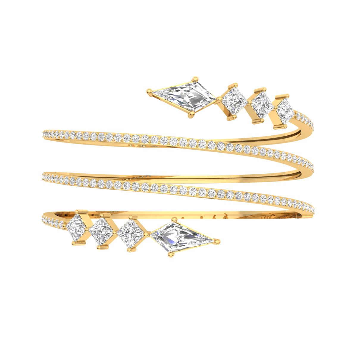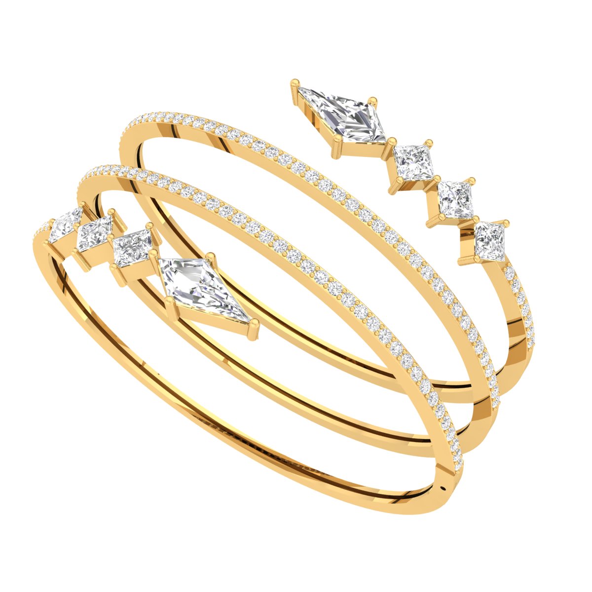 Command attention with The Aura Bracelet, a high jewelry masterpiece from Novaro. This distinctive design embraces your wrist a radiant stream of round-cut diamonds that culminate in two striking kite-cut lab-grown diamonds and precise princess-cut accents. It's a bold fusion of geometric artistry and dazzling sparkle, inviting you to define your own luxury and transform every moment into an unforgettable statement.